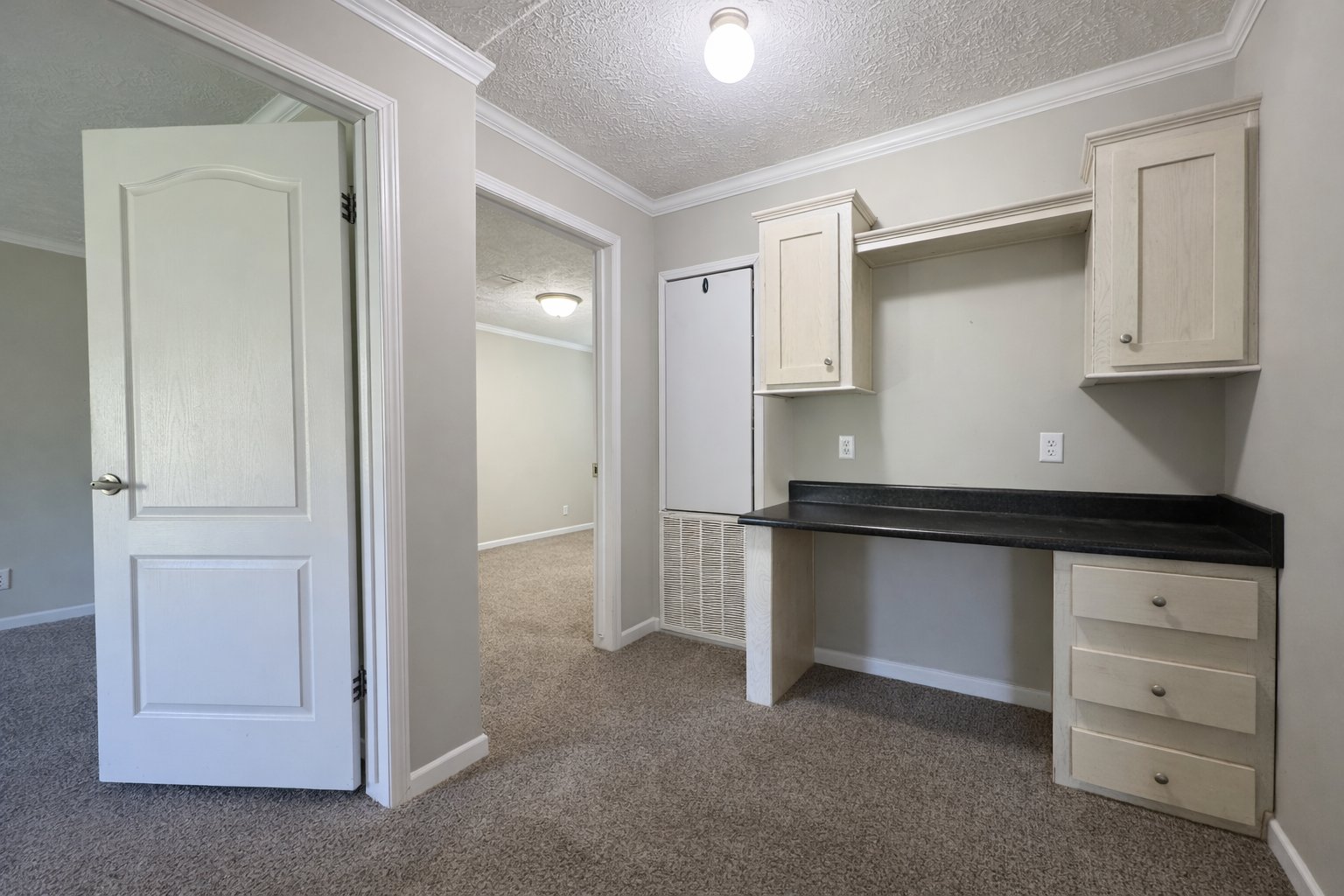 On the opposite side of the home, the floor plan continues to deliver flexibility. A hallway opens to an office area, making it easier to work from home, manage household tasks, or create a study nook. This side of the home also includes three additional bedrooms, each with ample closet space, along with a generously sized hall bath featuring double sinks and a shower. The separation of the bedroom spaces creates a practical arrangement for families, guests, or anyone needing extra room.