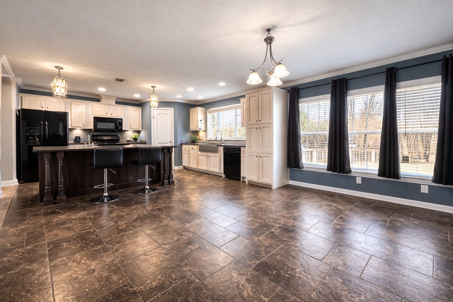 Inside, the layout is warm, spacious, and practical. The heart of the home is the large kitchen, which offers beautiful cabinetry, abundant workspace, and an ample breakfast area or dining space that opens into the main living area. This open-concept arrangement helps the home feel connected and comfortable, making it ideal for everyday living as well as gathering with family and friends. The fireplace in the living area adds a cozy focal point and enhances the welcoming feel of the home.