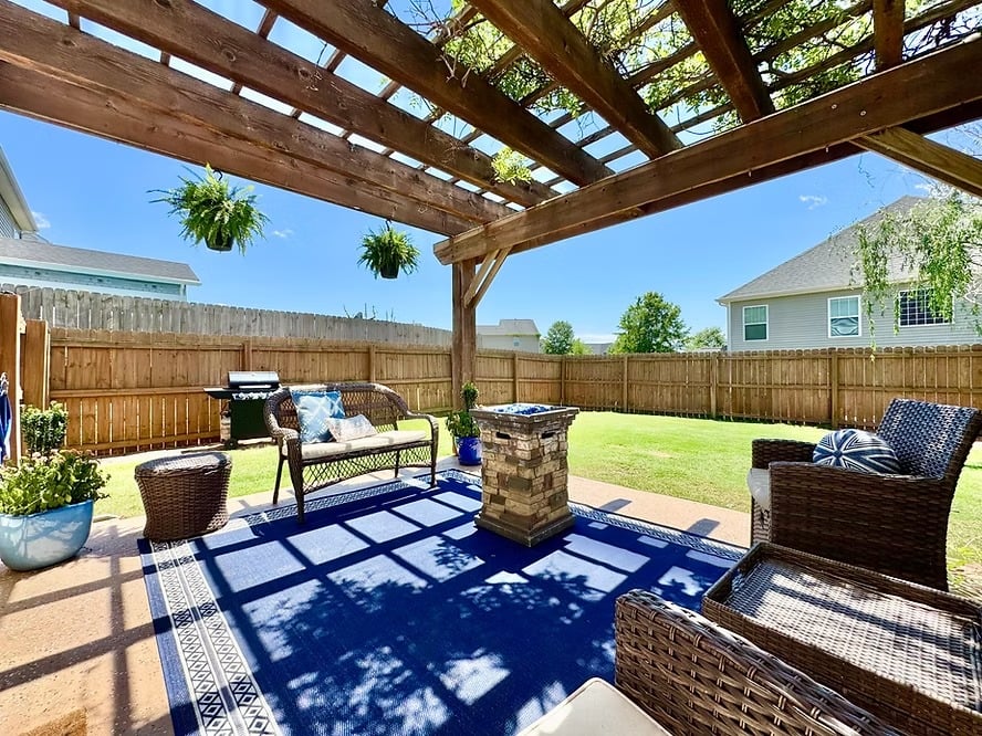 The kitchen is a dream for both everyday living and weekend hosting. It features a spacious pantry, ample counter space, and a functional design ideal for busy households. A cheerful eating nook includes a custom banquette from Ballard Designs, making it as stylish as it is practical. French doors lead from the living area to a pergola-covered patio—your private retreat—complete with a fenced backyard that’s perfect for pets, gardening, or outdoor gatherings.