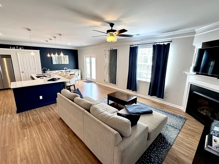 The welcoming foyer opens into an airy, light-filled living area anchored by a cozy gas fireplace—the perfect spot to relax or entertain. The seamless connection between the living room and kitchen creates an open-concept flow, while still preserving the warmth of defined spaces.