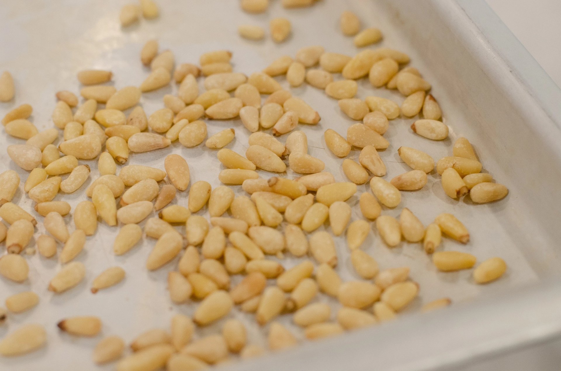 Then toast the pine nuts in a 350 degree oven for about 5 minutes until fragrant.