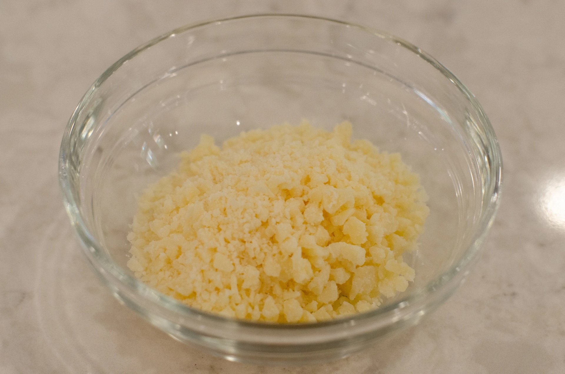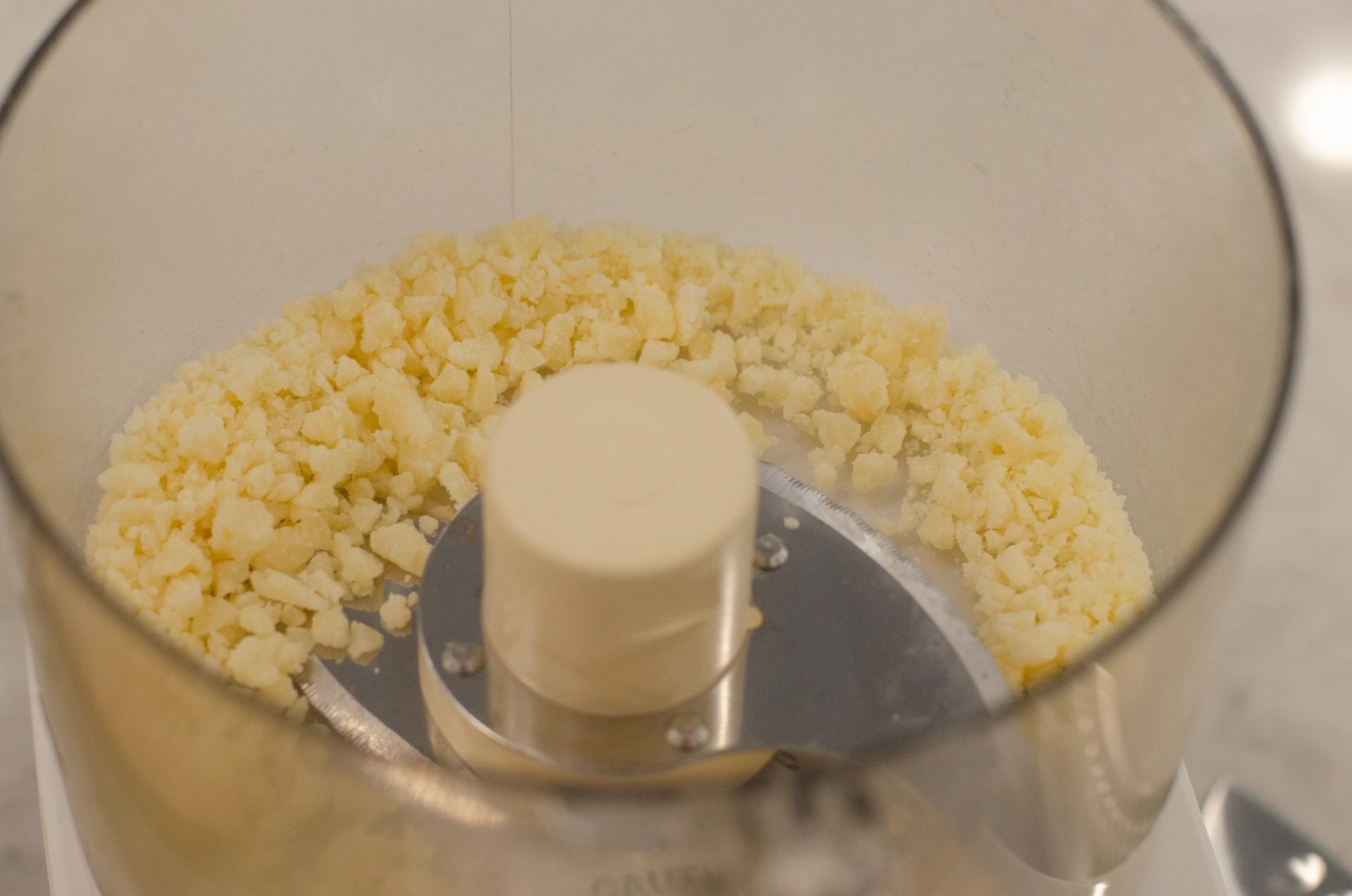 Spare yourself the time of grating the cheese and simply place a few small blocks of parmesan freed from the rind into your food processor fitted with the blade attachment. I discovered this quick time saver one night when I was too tired to grate.