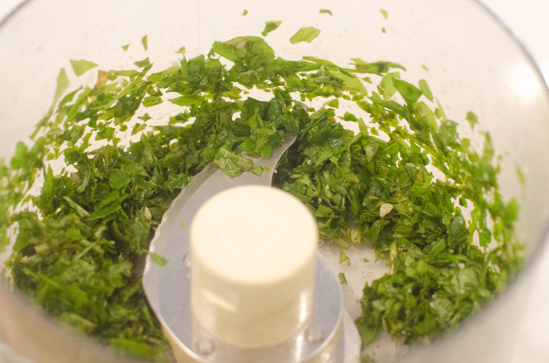 Wash, dry and rough chop about 1 cup of packed basil leaves. Into the food processor these go. Give them a whirl and a few pulses.