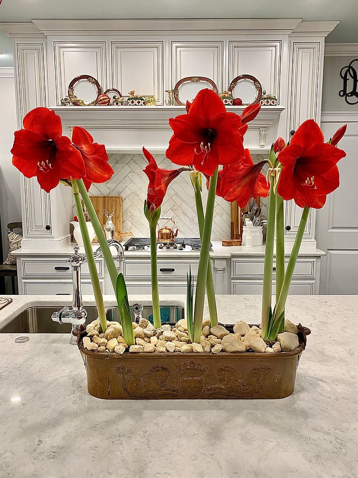 In the house the seven amaryllis bulbs I planted six weeks ago in an antique French copper fish poacher from 1860 are in glorious bloom. We will have to make this a family Christmas tradition as the boys and my wife are so enamored with them. How magical it is to plant a bulb, water, and have glorious vibrant red trumpet flowers bloom? Check out my blog on Amaryllis by clicking here. I also have our Poinsettia in place that was a gift from a friend.