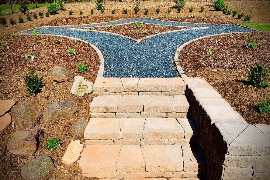 Our Landscape Architectural Firm, Collins Landscaping, designed our potager encircled by what one day will become a large box hedge so that the garden will become a parterre. In the center, four curving paths form a diamond reminiscent of the logo of my wife's alma mater, Furman University. This was by chance, but we love it!.