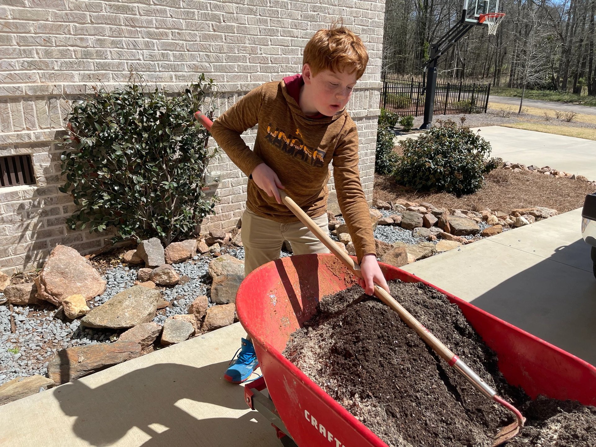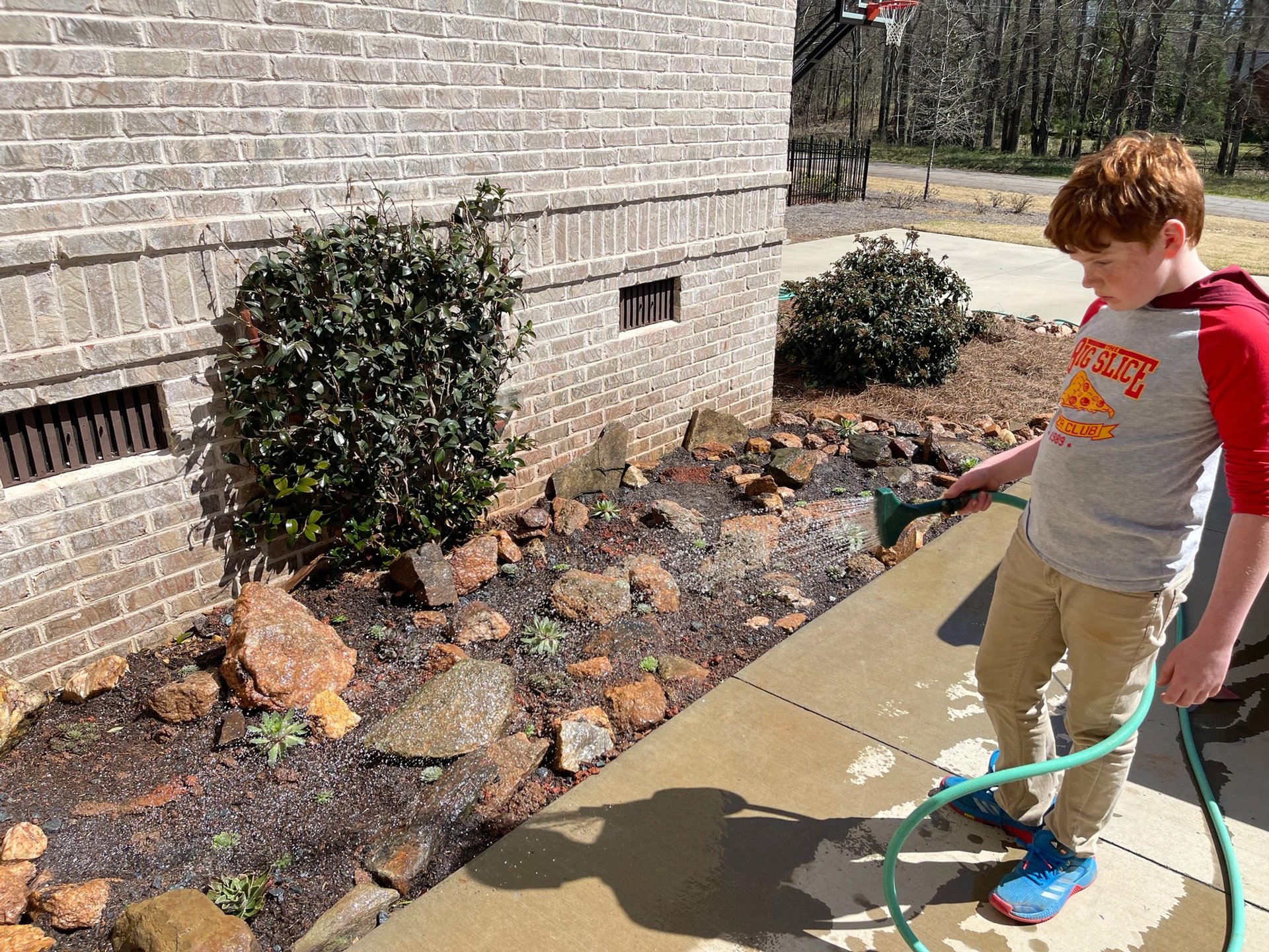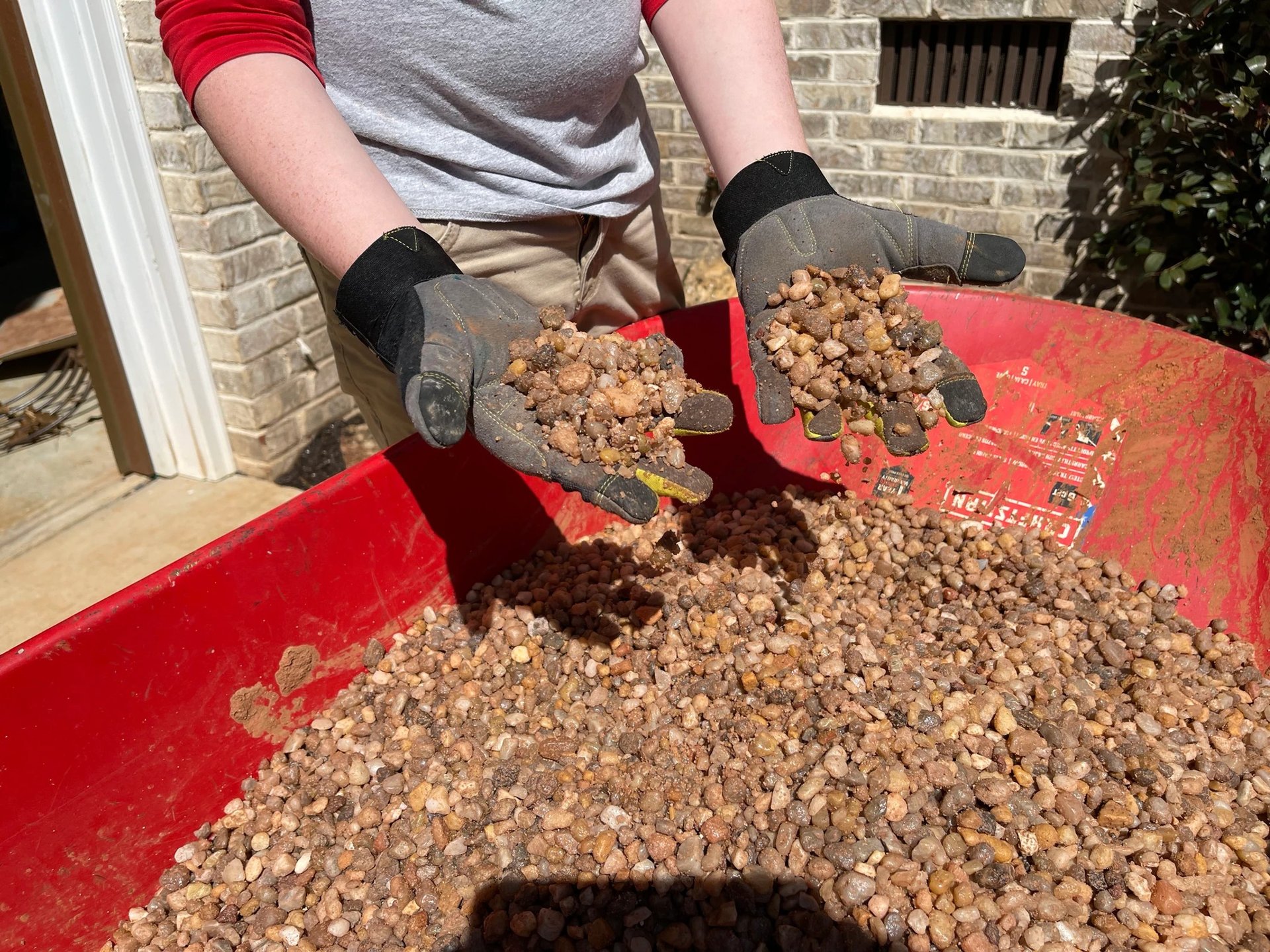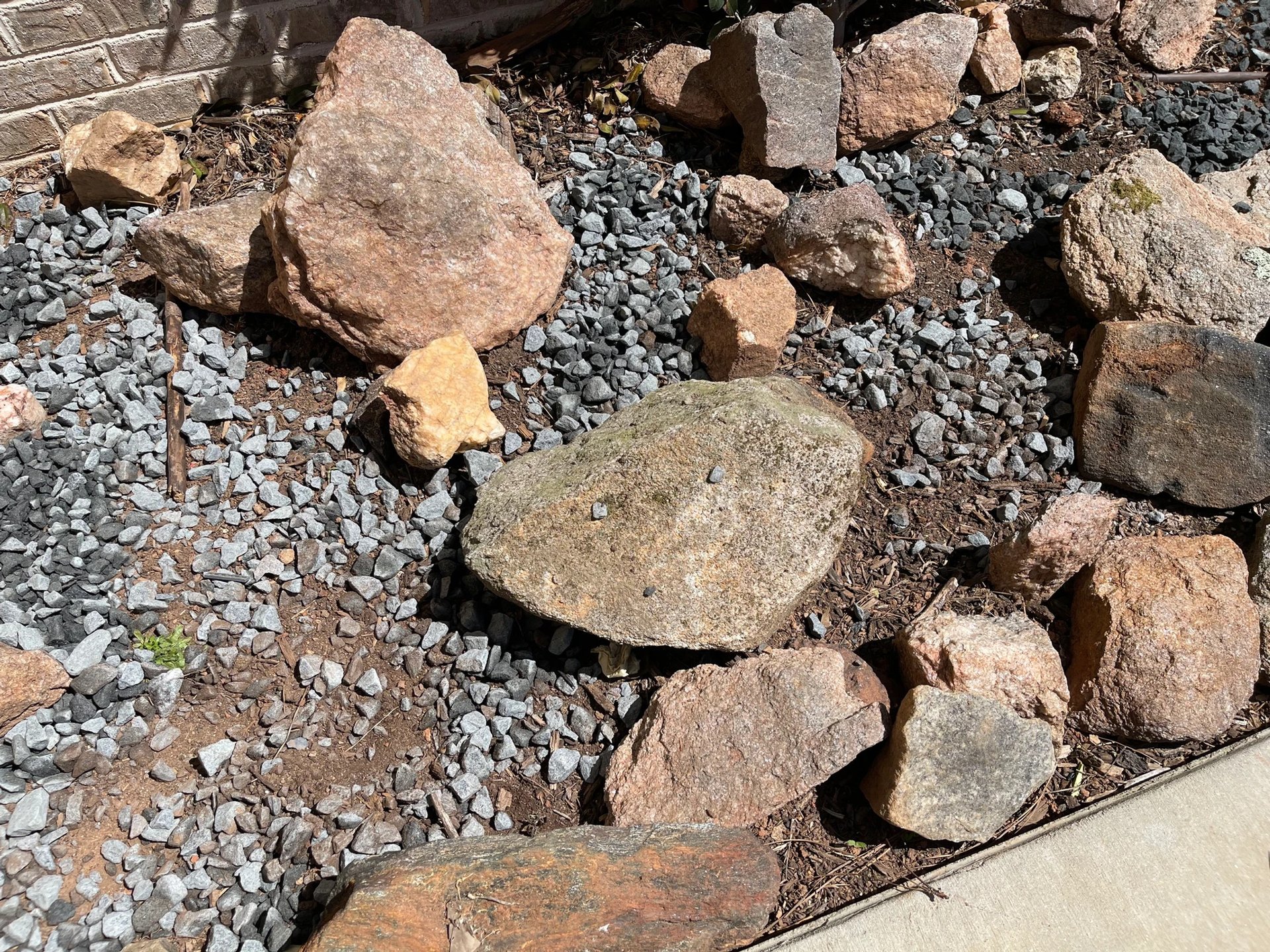 Then, we placed the rocks to make both a pleasing and natural shape and that would create pockets for the plants to thrive. Next it was on to the most important step, creating soil that would drain. We spread gravel all over the garden area. Then, me mixed a bag of play sand with garden soil and placed it around the stones.