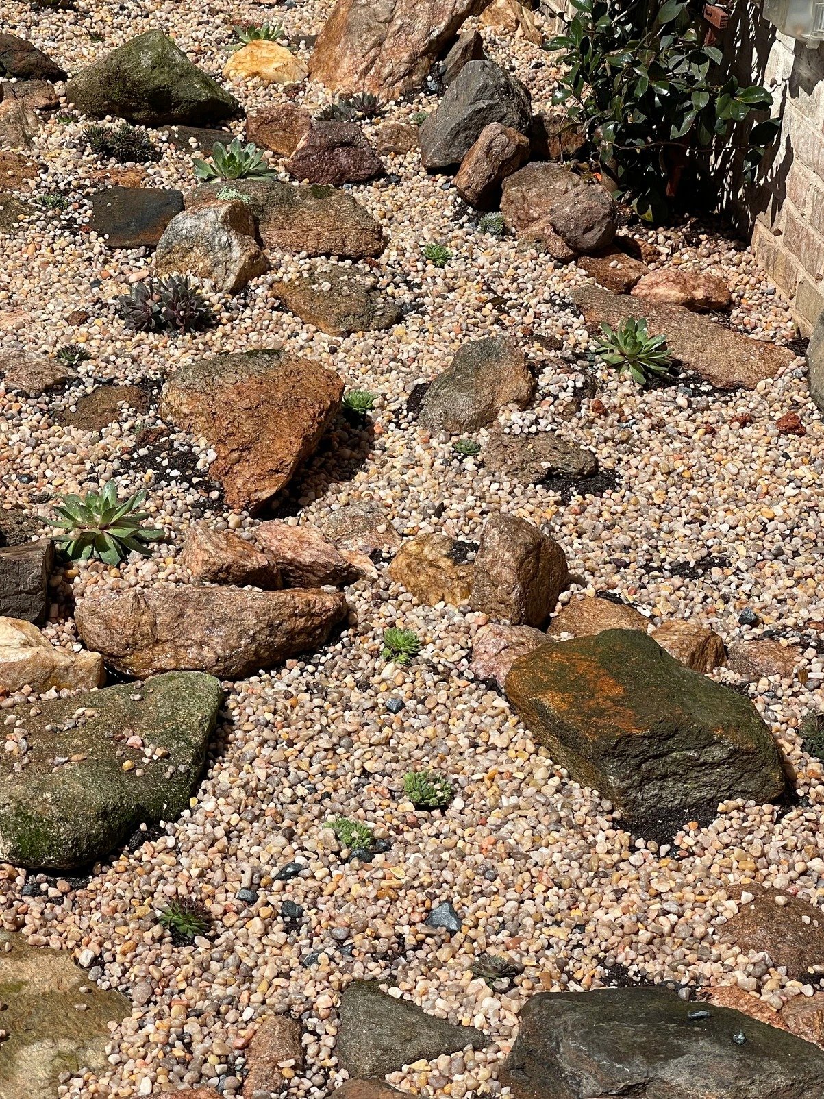 Finally we planted the hens and chickens to look as natural as possible and then covered the soil in a layer of pea gravel to complete the composition and watered in the plants well.
