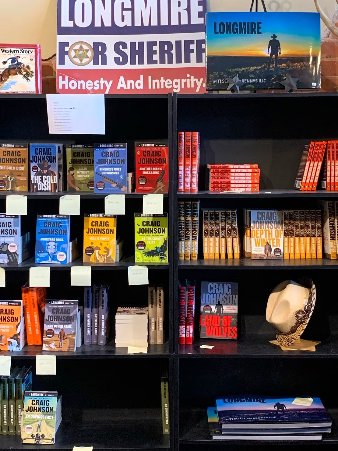 I had read on several blogs that Buffalo, Wyoming in the northern section of the state was the model for fictitious Durant, Wyoming, the setting for the Longmire books and TV series. Longmire is also set in a fictitious county called Absaroka. We decided to stop in Buffalo on the way to Cody from Rapid City. It’s a great example of a small western town, but as we walked around I did not see anything from the show. Then, out of blue, I geeked out when I saw a shop called, “Longmire Headquarters”. We walked in and discovered a shop filled with western-wear, native American jewelry and books by Craig Johnson. It turned out the author and his wife owned the store!