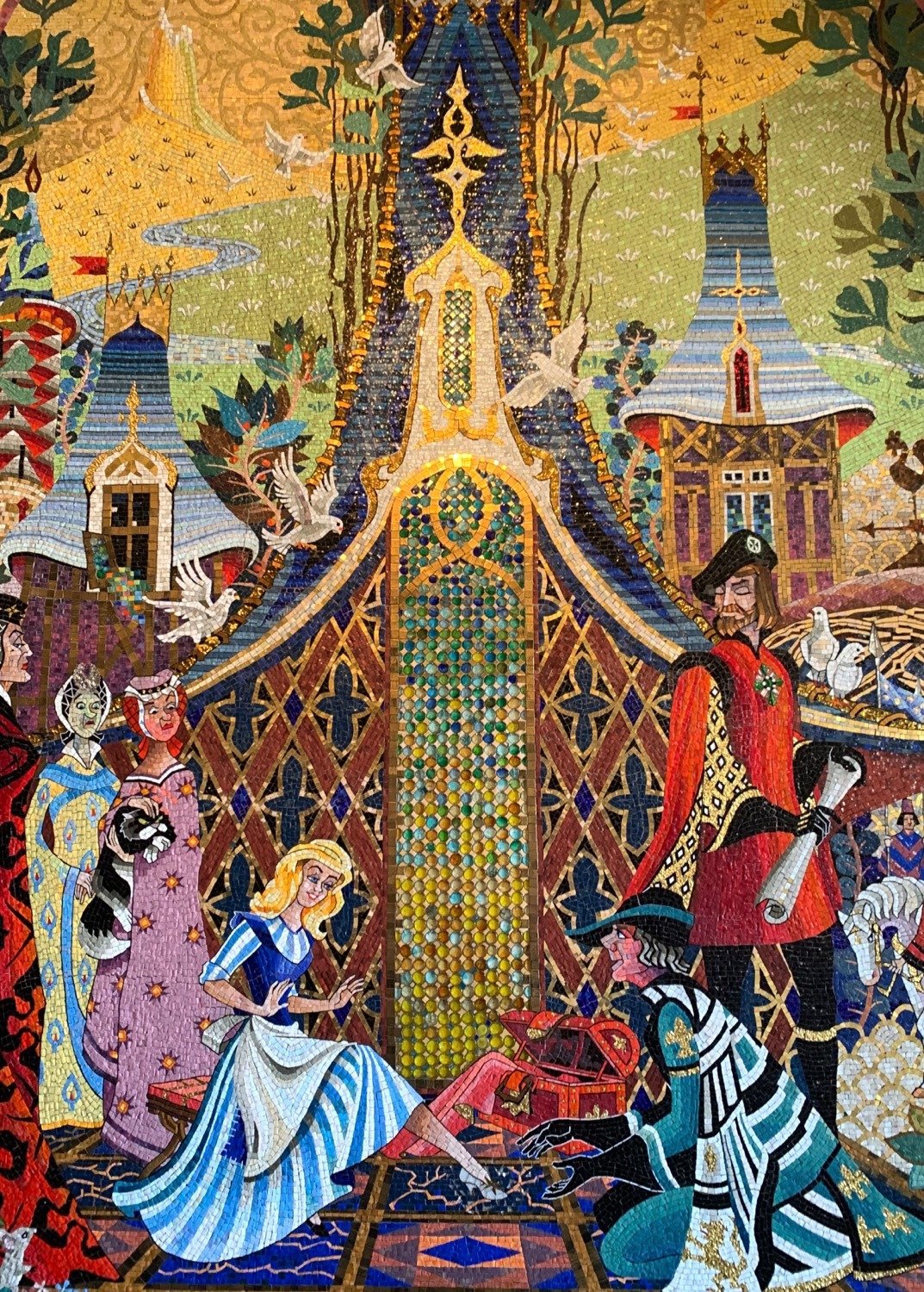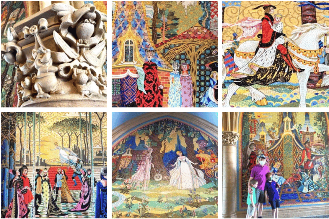 If you are a Disney fan, and my family certainly is, then there is a little secret place you need to seek out on your next visit. Next time you find yourself at Walt Disney World make sure to walk in the entrance through the portcullis of Cinderella’s Castle and stop a short moment to look at the story all made of tiny glass tesserae, covering the walls.