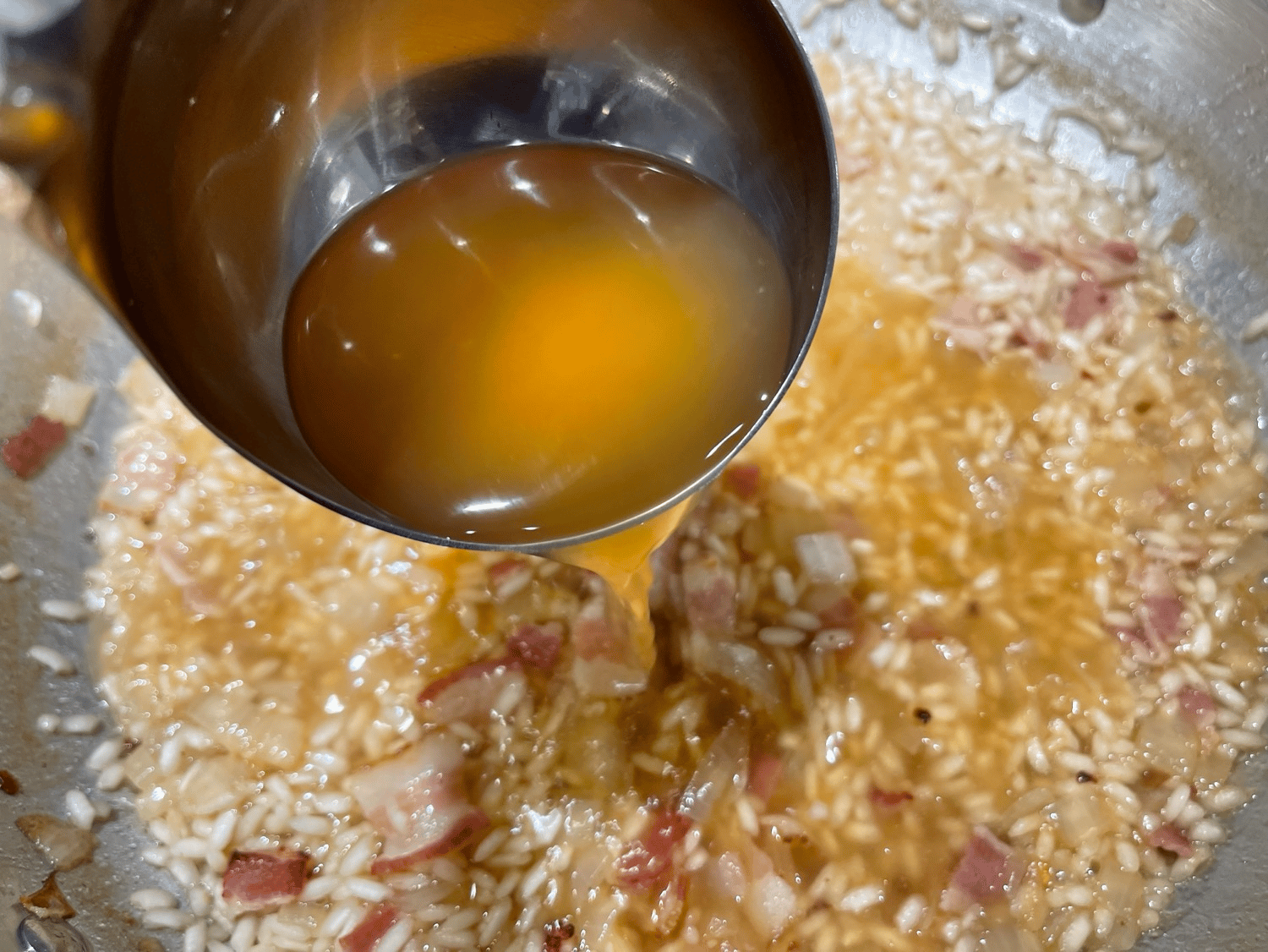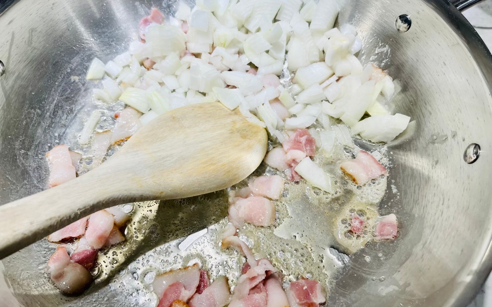 Simultaneously heat four cups of vegetable stock (I use Swanson) in a sauce pan. When the bacon begins to render add one chopped onion. Once the onion is translucent add two to three cloves of chopped garlic and cook for one minute.