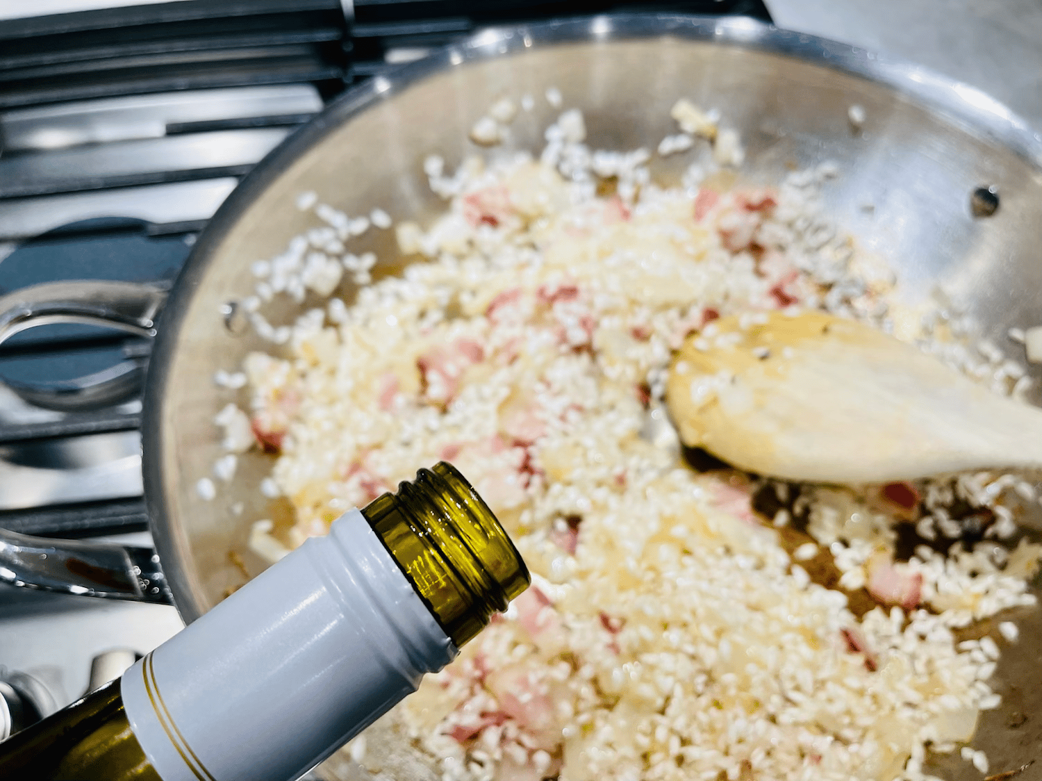 Then, add about half a cup of Chardonnay wine. (You can always substitute the wine for more stock but it won’t taste exactly the same).