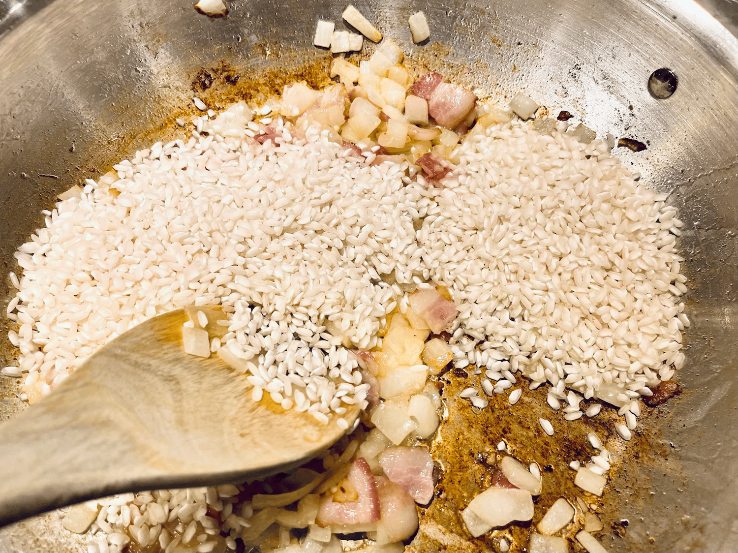 Then, add 1 1/2 cups Arborio rice. Toss the rice in the butter and onions until fully coated.