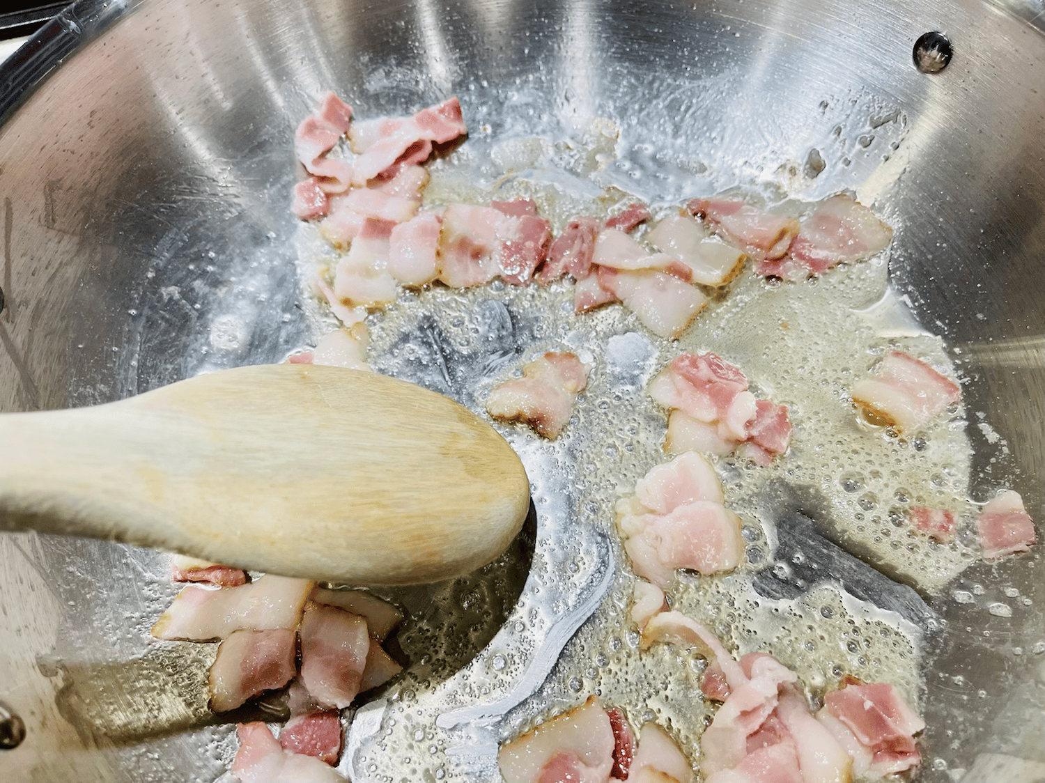 In a large, high-rimmed sauté pan heat one tablespoon of butter with three strips of chopped bacon on medium high heat.