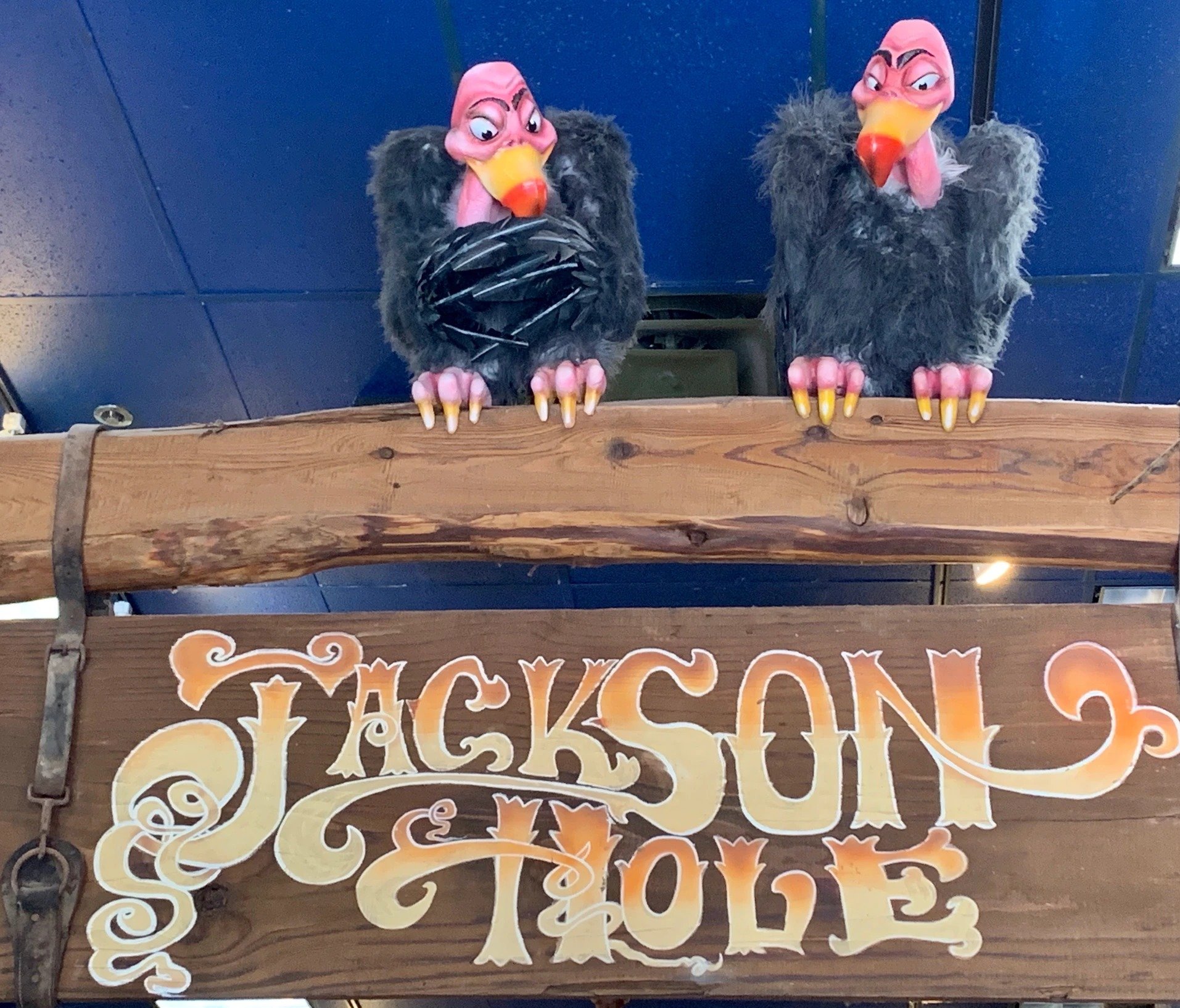 The owner’s children, who kept the store, met us at the door in full cowboy regalia: hat, boots etc. They were real-life bull riders! They opened the doors to a western wonderland. The walls were adorned with western frontier decorations. Stuffed animals from the Tetons greeted us along with a talking moose and buffalo. A red barn held the stuffed animals, a Native American’s headdress was filled with feather-shaped suckers and even a pair of vultures stood guard at the entrance.