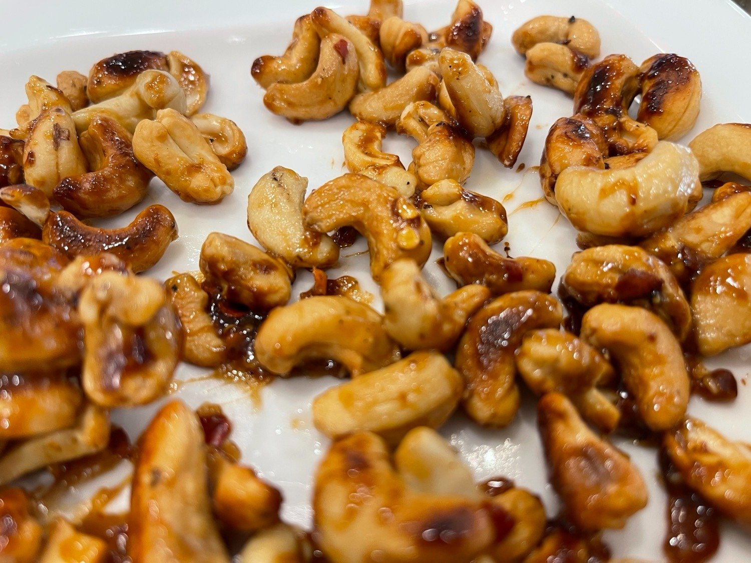 In a small non-stick sauté pan heat a teaspoon of butter on high. Add a quarter cup of cashews, immediately toss in a tablespoon maple syrup with a sprinkling salt and a crack of black pepper and a scant amount of red pepper flake. The mixture will foam. Once the nuts begin to brown and the liquid begins to evaporate remove from heat, and placed on a cold plate to solidify. Then, break up the nuts and add them to the salad.