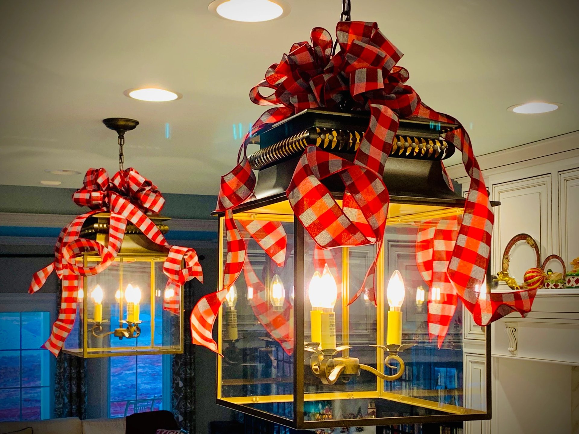 Plaids are big big big this year! We see plaids in ribbons, throws and wrapping paper. Here is a trend from fashion that has spread to our holiday decor. Plaid ribbon found its way onto our kitchen lights below.