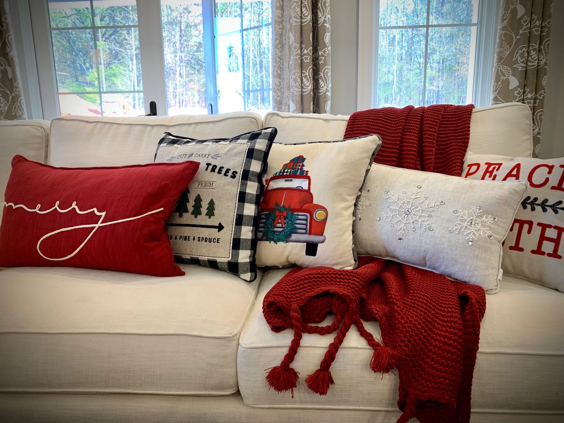 Wham! Put some red pillows and fluffy plaid blankets around or festive pillows from the department store on your couch and you have instant holiday cheer. You can find these just about anywhere from Big Lots to Pottery Barn. This is a huge new trend I never saw as a kid. Here are some of ours below.